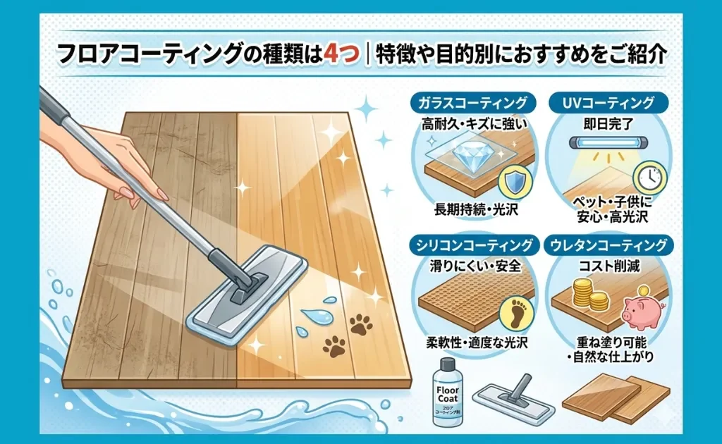 皮膜が硬く、ちょっとした傷では床材まで届きません。特にガラスコーティングは非常に硬度が高いです。 - 仕上がりを選べる