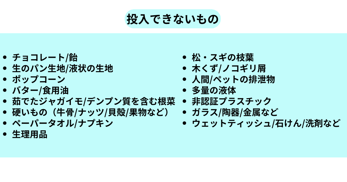 主に、分解できず故障の原因になるもの(発火・破損・詰まりなど)が投入対象外となります。