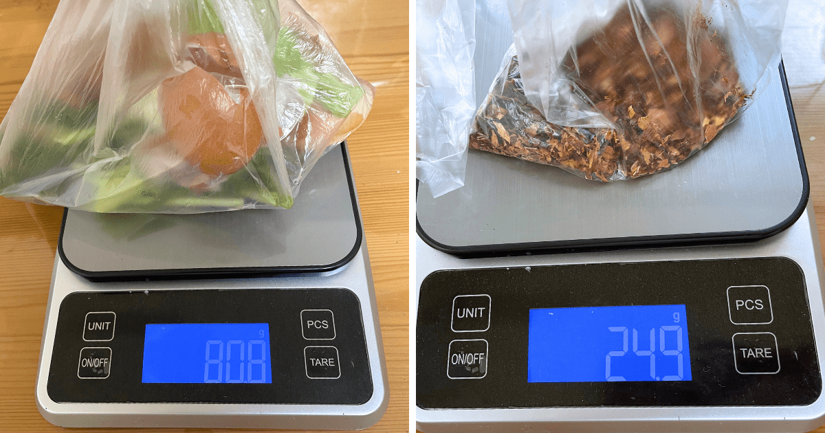 処理前は80gあった生ゴミが、処理後はわずか24gに!