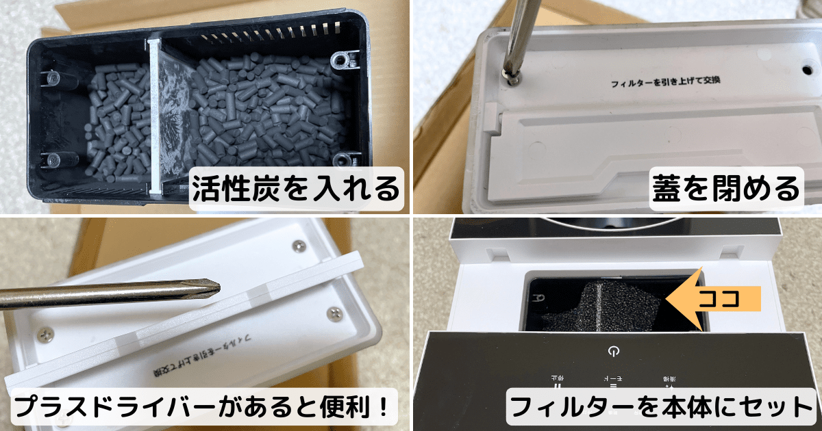 活性炭とフィルター本体は別々に梱包されているため、粒状の活性炭を自分で入れてセットします。