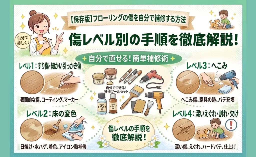 - 【保存版】フローリングの傷を自分で補修する方法|傷レベル別の手順を徹底解説!
